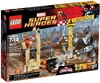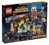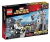 76002 Superman: Metropolis Showdown depicts a fight between Superman with a yellow and black sports car and General Zod with a black satellite on a grey and tan base, that has a feature to launch the car.