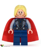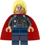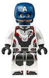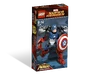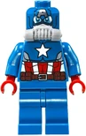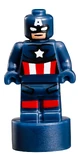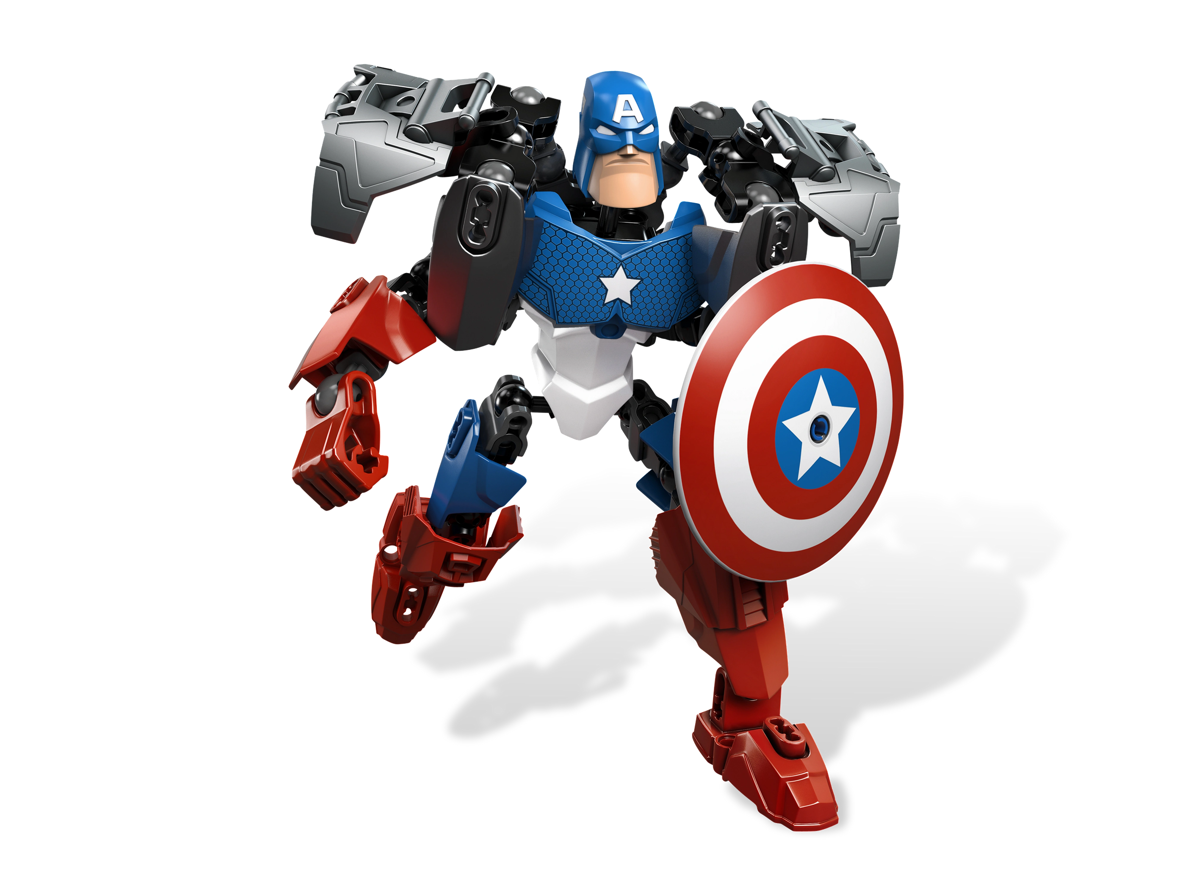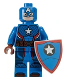 Captain America's blue parts are a brighter shade than the minifigures, and he has white comic eyes, rather than more realistic ones like the minifigure. He also has a white waist, and silver armor on his shoulders.
