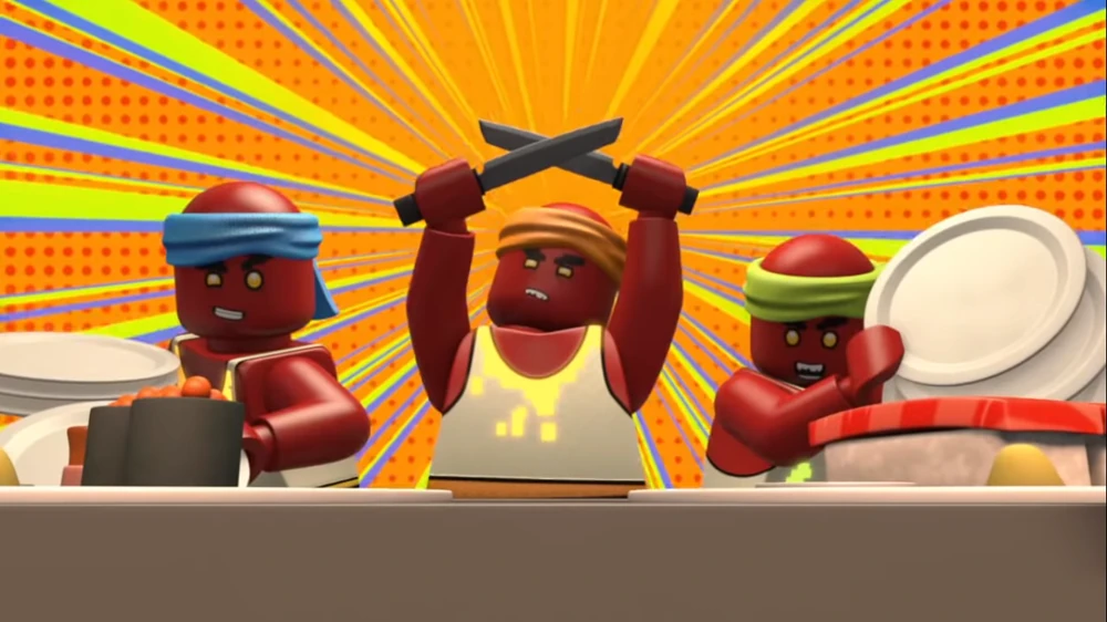 Sushimi has several lesser chefs working under him in Prime Empire, distinguished by blue, orange, and green head wraps. The group also includes a hostess (voiced by Shannon Chan-Kent) who attacks Jay and Nya with cleavers, after initially feigning friendliness.