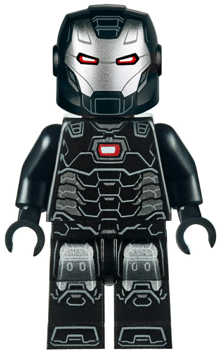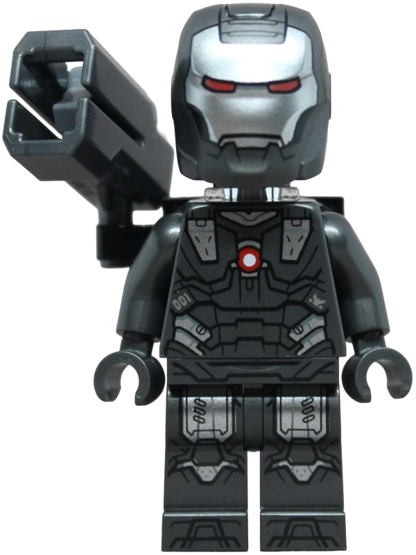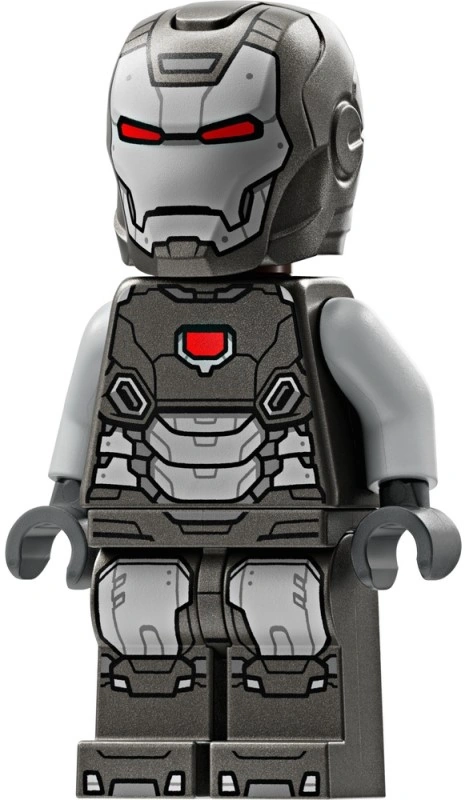War Machine has the same helmet as Iron Man in different colours, with medium stone grey in place of red and light metallic silver in place of the gold, which is the colour scheme for the rest of the suit. Underneath the helmet is a brown head printed with cheek bones, lines under the eyes, and a dual expression (neutral and angry). The rest of the body is medium stone grey. The torso is printed on the front and back: the front features the arc reactor in an rounded rectangle shape with red in it and under that is FF 446, the chest has light grey near the abdomen area and on each side of it is written Danger on the connectors, and on the upper right chest plate near the arm is 002. The back features the back of the armour, with a blue star on the right shoulder blade and arrows on the left. The legs are printed with the pelvis area and the knee pads, which are light grey. Part of the boot is printed on the toes. On his left knee pad there is a five-pointed star.
