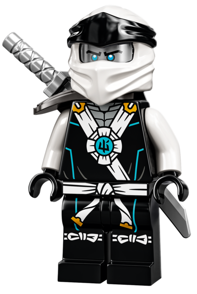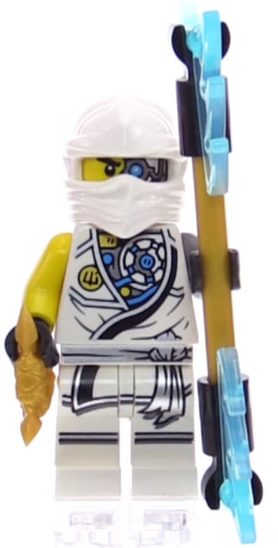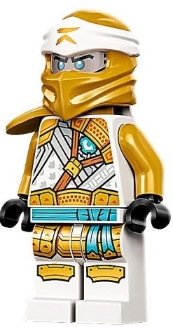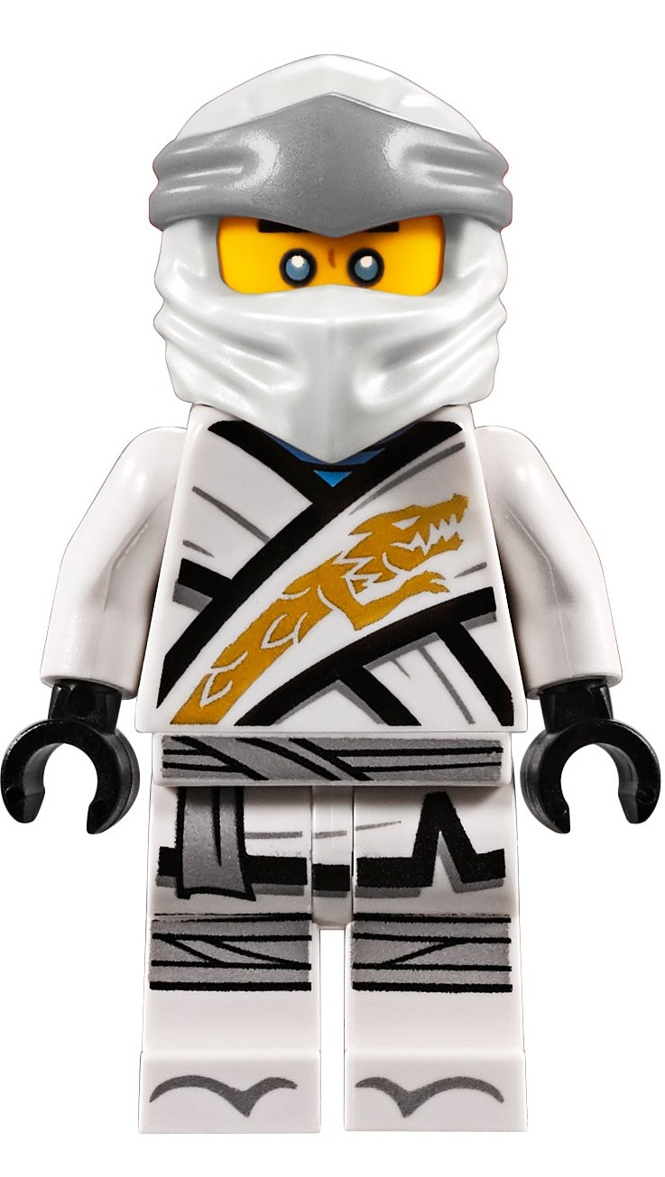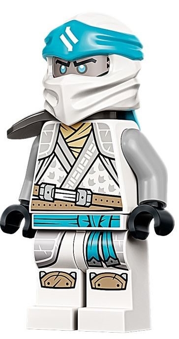Zane has a golden visor which resembles the top of the ice dragon design. He still wears mostly white, but in ZX form he also wears golden shoulder armor which can hold two katanas in the back. Zane's face is the same as always, but his torso has been updated with the under-robes being white, instead of grey, and having tan embroidering, as well as a printed design of some lightweight armor. On the back is the golden ice dragon symbol, which is absent from the front. Zane's torso pattern continues onto his legs.