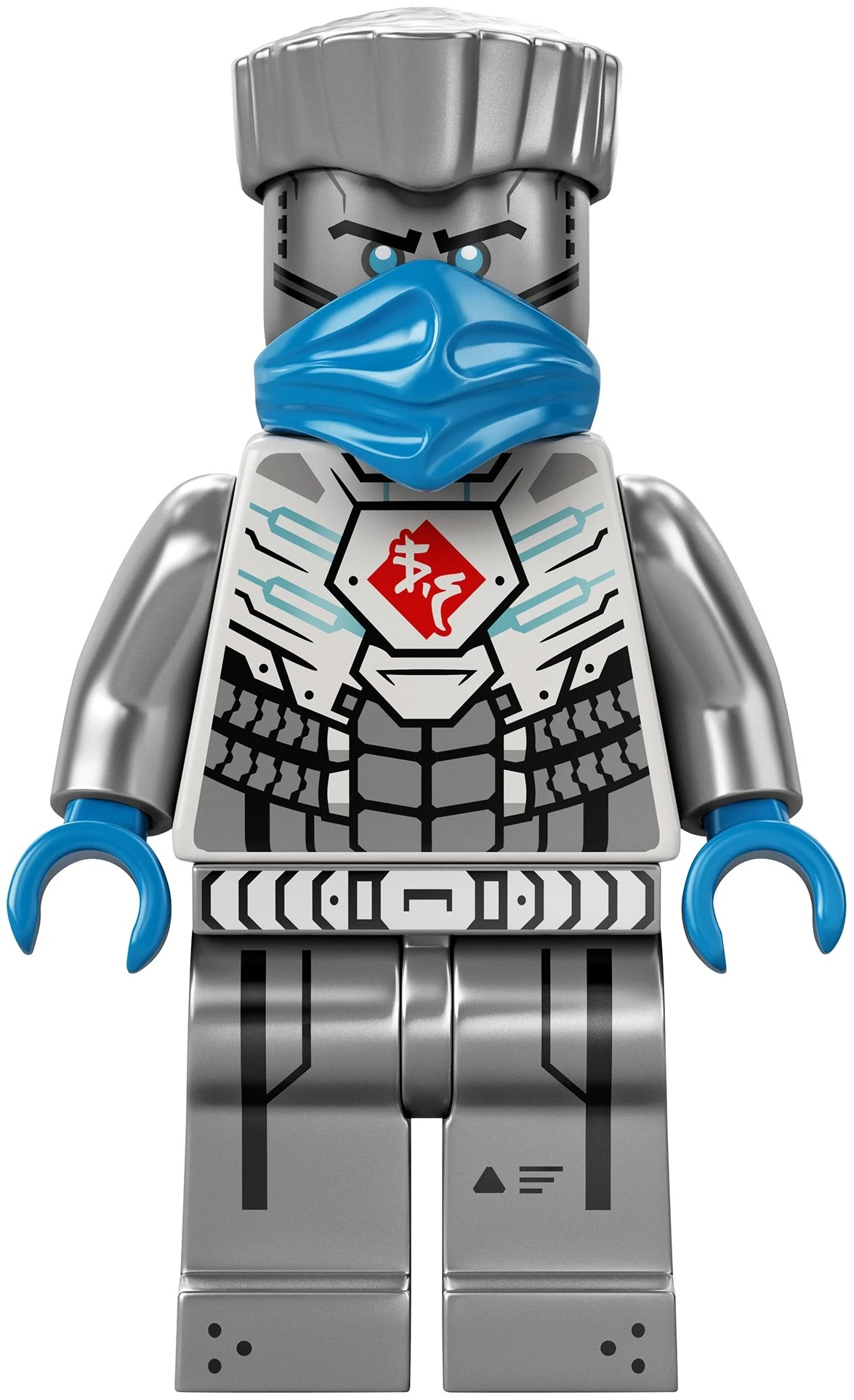 Zane's Ninja variant for the Sons of Garmadon theme incorporated the new two-piece hood design, but this time the headband was molded in black with a light blue symbol decorating the forehead. This variant would feature a new Titanium faceprint for Zane, depicting an angry expression on one side and a circular port on the back of his head. In 2019 another release of this figure would include the new for 2019 Ninjago: Legacy hood.